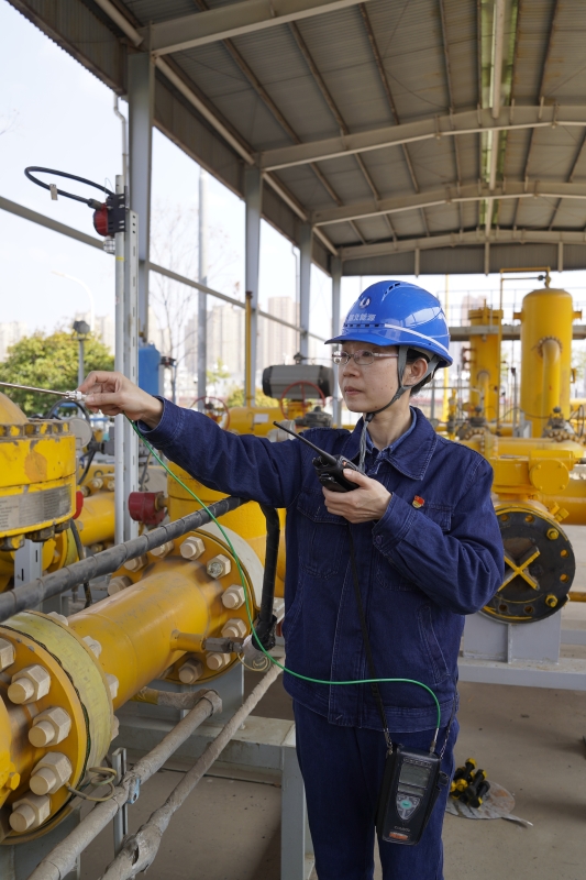 严群用可燃气体检测仪检测天然气是否泄漏(综合能源公司供稿)