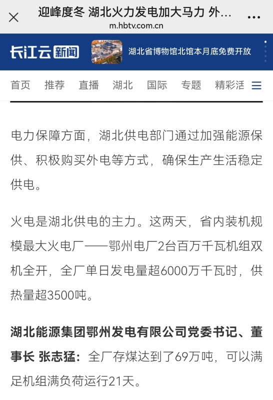湖北新闻:迎峰度冬 湖北火力发电加大马力 外购电做好送电保障